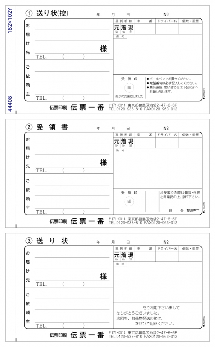 配送伝票 | 配達 | No.44408 ★★★★★ 送り状 B6変形横型(182X102mm) | 伝票印刷,伝票制作,オリジナル,複写,専用下敷き,名入れ無料,版代無料,代引手数料無料,振込手数料無料