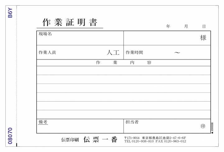 業種別一覧 作業日報 作業証明書 常用伝票 建設業専用伝票 リサイクルショップ買取伝票 配送伝票 警備伝票 服飾取扱伝票 小売サービス専用伝票 寺・神社専用伝票 オリジナル伝票 作業証明書 作業証明書[作業内容] No.08070No.08070 作業証明書 B6横型(182×128mm) ※ご注文・見積りは下段からできます。 ※ご注文・見積りは下段からできます。 作業証明書 No.08070 作業証明書の「伝票一番」。まずは、お見積りから、お気軽にどうぞ。 複写枚数(紙色) 2枚(白・黄) 502 2枚(白・白) 532 3枚(白・黄・ピンク) 503 3枚(白・黄・青) 593 4枚(白・青・黄・ピンク) 504 5枚(白・白・青・黄・ピンク) 505 注文冊数 10冊(5枚複写は選べません) 20冊 30冊 40冊 50冊 100冊 200冊 300冊 他は備考欄にご記入下さい 伝票サイズ・オプションついてはこちら>>