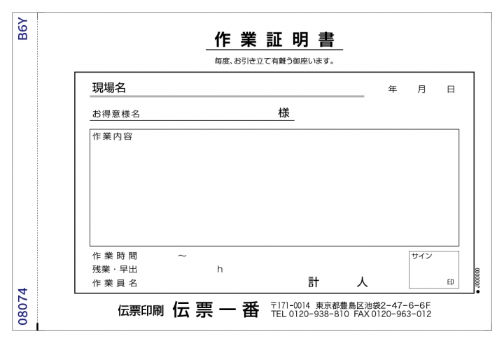 業種別一覧 作業日報 作業証明書 常用伝票 建設業専用伝票 リサイクルショップ買取伝票 配送伝票 警備伝票 服飾取扱伝票 小売サービス専用伝票 寺・神社専用伝票 オリジナル伝票 作業証明書 作業証明書[作業内容] No.08074No.08074 作業証明書 B6横型(182×128mm) ※ご注文・見積りは下段からできます。 ※ご注文・見積りは下段からできます。 作業証明書 No.08074 作業証明書の「伝票一番」。まずは、お見積りから、お気軽にどうぞ。 複写枚数(紙色) 2枚(白・黄) 502 2枚(白・白) 532 3枚(白・黄・ピンク) 503 3枚(白・黄・青) 593 4枚(白・青・黄・ピンク) 504 5枚(白・白・青・黄・ピンク) 505 注文冊数 10冊(5枚複写は選べません) 20冊 30冊 40冊 50冊 100冊 200冊 300冊 他は備考欄にご記入下さい 伝票サイズ・オプションついてはこちら>>