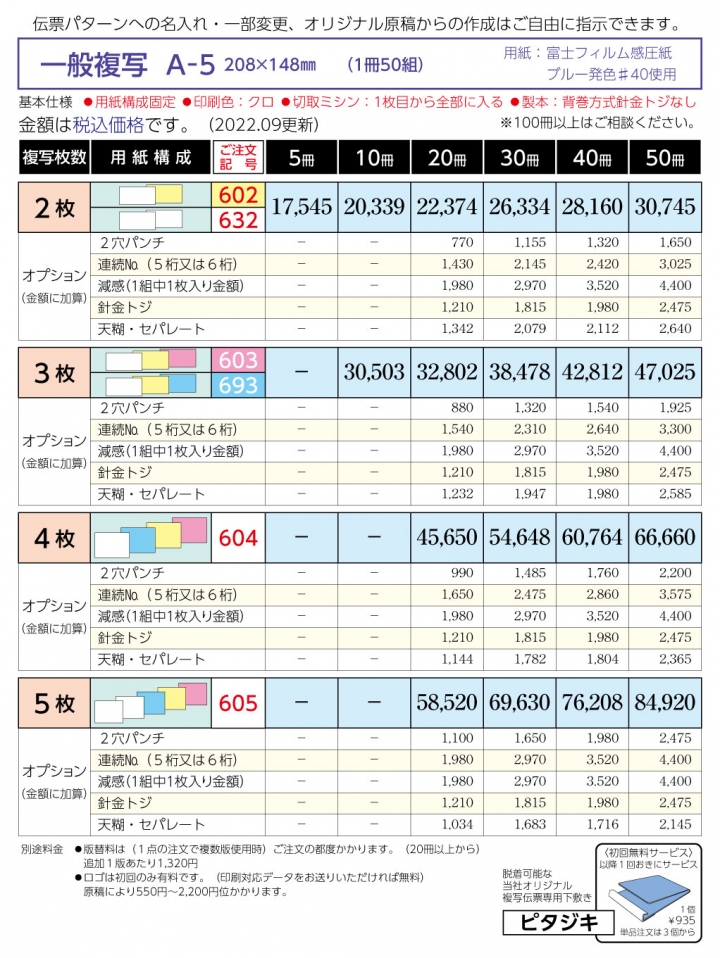 業種別一覧 作業日報 作業証明書 常用伝票 建設業専用伝票 リサイクルショップ買取伝票 配送伝票 警備伝票 服飾取扱伝票 小売サービス専用伝票 寺・神社専用伝票 オリジナル伝票 作業証明書 作業証明書[作業内容] No.07965No.07965 ★★★★★ 作業証明書 A5横型(208×148mm) ※ご注文・見積りは下段からできます。 ※ご注文・見積りは下段からできます。 作業証明書 No.07965 作業証明書の「伝票一番」。まずは、お見積りから、お気軽にどうぞ。 複写枚数(紙色) 2枚(白・黄) 602 2枚(白・白) 632 3枚(白・黄・ピンク) 603 3枚(白・黄・青) 693 4枚(白・青・黄・ピンク) 604 5枚(白・白・青・黄・ピンク) 605 注文冊数 5冊(3枚、4枚、5枚複写は選べません) 10冊(4枚、5枚複写は選べません) 20冊 30冊 40冊 50冊 100冊 200冊 300冊 他は備考欄にご記入下さい 伝票サイズ・オプションついてはこちら>>