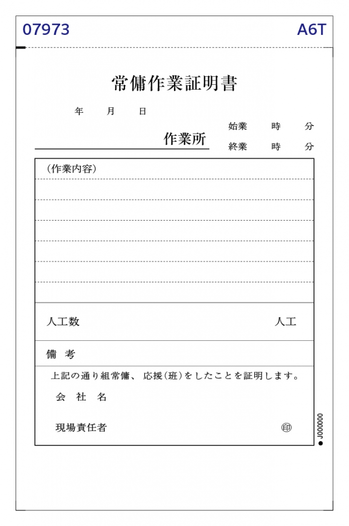 業種別一覧 作業日報 作業証明書 常用伝票 建設業専用伝票 リサイクルショップ買取伝票 配送伝票 警備伝票 服飾取扱伝票 小売サービス専用伝票 寺・神社専用伝票 オリジナル伝票 作業証明書 作業証明書[作業内容] No.07973No.07973 ★★★★★ 常傭作業証明書 B6縦型(128×182mm) ※ご注文・見積りは下段からできます。 ※ご注文・見積りは下段からできます。 常傭作業証明書 No.07973 作業証明書の「伝票一番」。まずは、お見積りから、お気軽にどうぞ。 複写枚数(紙色) 2枚(白・黄) 502 2枚(白・白) 532 3枚(白・黄・ピンク) 503 3枚(白・黄・青) 593 4枚(白・青・黄・ピンク) 504 5枚(白・白・青・黄・ピンク) 505 注文冊数 10冊(5枚複写は選べません) 20冊 30冊 40冊 50冊 100冊 200冊 300冊 他は備考欄にご記入下さい 伝票サイズ・オプションついてはこちら>>
