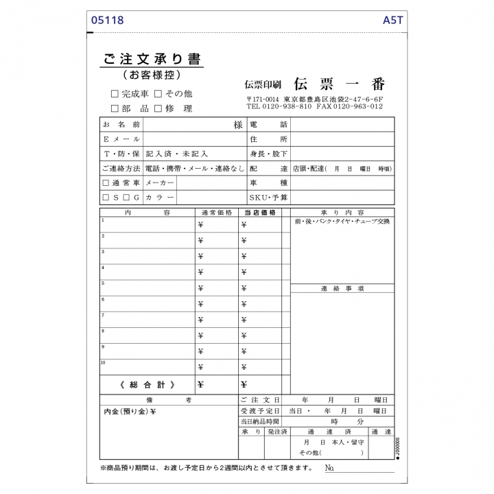 業種別一覧 作業日報 作業証明書 常用伝票 建設業専用伝票 リサイクルショップ買取伝票 配送伝票 警備伝票 服飾取扱伝票 小売サービス専用伝票 寺・神社専用伝票 オリジナル伝票 小売サービス専用伝票 自転車 №05118№05118 ご注文承り書 A5縦型(148×208mm) ※ご注文・見積りは下段からできます。 ※ご注文・見積りは下段からできます。 ご注文承り書 №05118 まずは、お見積りから、お気軽にどうぞ。 複写枚数(紙色) 2枚(白・黄) 602 2枚(白・白) 632 3枚(白・黄・ピンク) 603 3枚(白・黄・青) 693 4枚(白・青・黄・ピンク) 604 5枚(白・白・青・黄・ピンク) 605 注文冊数 5冊(3〜5枚複写は選べません) 10冊(4〜5枚複写は選べません) 20冊 30冊 40冊 50冊 100冊 200冊 300冊 他は備考欄にご記入下さい 伝票サイズ・オプションついてはこちら>>