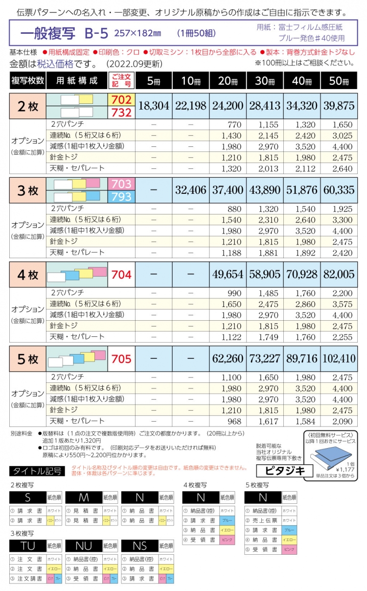 カタログ一覧 インボイス対応伝票 納品書 請求書 見積書 見積書 見積書(B5サイズ) No.18見積書 No.18 ※ご注文・見積りは下段からできます。 ※ご注文・見積りは下段からできます。 消費税対応あり 複写枚数(紙色) 2枚(白・黄) 702 2枚(白・白) 732 3枚(白・黄・ピンク) 703 3枚(白・黄・青) 793 4枚(白・青・黄・ピンク) 704 5枚(白・白・青・黄・ピンク) 705 注文冊数 5冊(3〜5枚複写は選べません) 10冊(4〜5枚複写は選べません) 20冊 30冊 40冊 50冊 100冊 200冊 300冊 他は備考欄に記入下さい 伝票サイズ・オプションついてはこちら>>