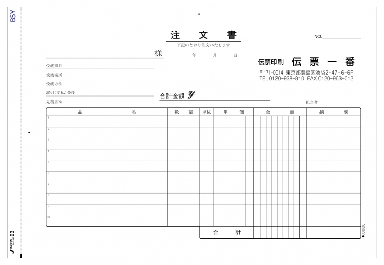 カタログ一覧 インボイス対応伝票 納品書 請求書 見積書 見積書 見積書(B5サイズ) No.23注文書 No.23 ※ご注文・見積りは下段からできます。 ※ご注文・見積りは下段からできます。 消費税対応あり 複写枚数(紙色) 2枚(白・黄) 702 2枚(白・白) 732 3枚(白・黄・ピンク) 703 3枚(白・黄・青) 793 4枚(白・青・黄・ピンク) 704 5枚(白・白・青・黄・ピンク) 705 注文冊数 5冊(3〜5枚複写は選べません) 10冊(4〜5枚複写は選べません) 20冊 30冊 40冊 50冊 100冊 200冊 300冊 他は備考欄に記入下さい 伝票サイズ・オプションついてはこちら>>