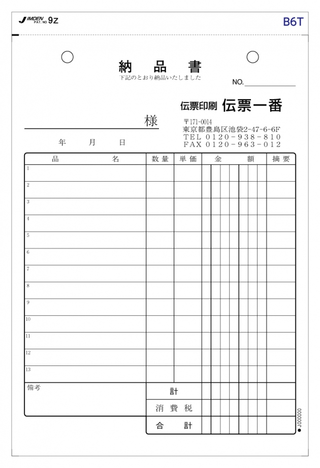 カタログ一覧 インボイス対応伝票 納品書 請求書 見積書 納品書 納品書(B6サイズ) No.9納品書 No.9 ※ご注文・見積りは下段からできます。 ※ご注文・見積りは下段からできます。 消費税対応あり 複写枚数(紙色) 2枚(白・黄) 502 2枚(白・白) 532 3枚(白・黄・ピンク) 503 3枚(白・黄・青) 593 4枚(白・青・黄・ピンク) 504 5枚(白・白・青・黄・ピンク) 505 注文冊数 10冊(5枚複写は選べません) 20冊 30冊 40冊 50冊 100冊 200冊 300冊 他は備考欄に記入下さい 伝票サイズ・オプションついてはこちら>>