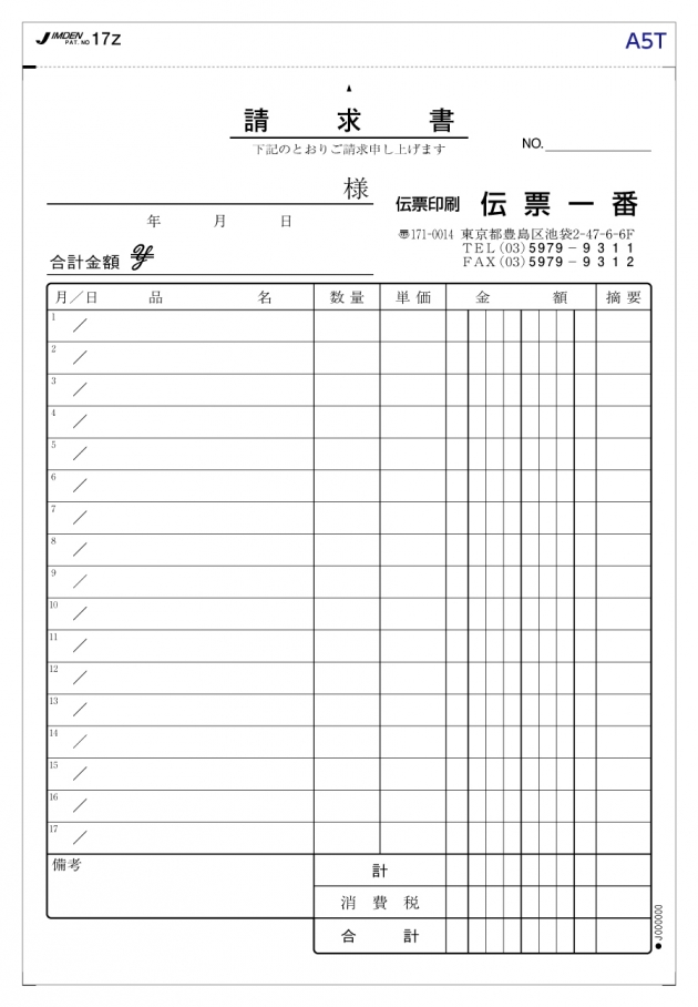 カタログ一覧 インボイス対応伝票 納品書 請求書 見積書 請求書 請求書(A5サイズ) No.17請求書 No.17 ※ご注文・見積りは下段からできます。 ※ご注文・見積りは下段からできます。 消費税対応あり 複写枚数(紙色) 2枚(白・黄) 602 2枚(白・白) 632 3枚(白・黄・ピンク) 603 3枚(白・黄・青) 693 4枚(白・青・黄・ピンク) 604 5枚(白・白・青・黄・ピンク) 605 注文冊数 5冊(3〜5枚複写は選べません) 10冊(4〜5枚複写は選べません) 20冊 30冊 40冊 50冊 100冊 200冊 300冊 他は備考欄に記入下さい 伝票サイズ・オプションついてはこちら>>