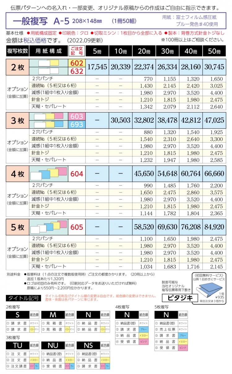 カタログ一覧 インボイス対応伝票 納品書 請求書 見積書 納品書 納品書(A5サイズ) No.128納品書 No.128 ※ご注文・見積りは下段からできます。 ※ご注文・見積りは下段からできます。 消費税対応あり 複写枚数(紙色) 2枚(白・黄) 602 2枚(白・白) 632 3枚(白・黄・ピンク) 603 3枚(白・黄・青) 693 4枚(白・青・黄・ピンク) 604 5枚(白・白・青・黄・ピンク) 605 注文冊数 5冊(3〜5枚複写は選べません) 10冊(4〜5枚複写は選べません) 20冊 30冊 40冊 50冊 100冊 200冊 300冊 他は備考欄にご記入下さい 伝票サイズ・オプションついてはこちら>>